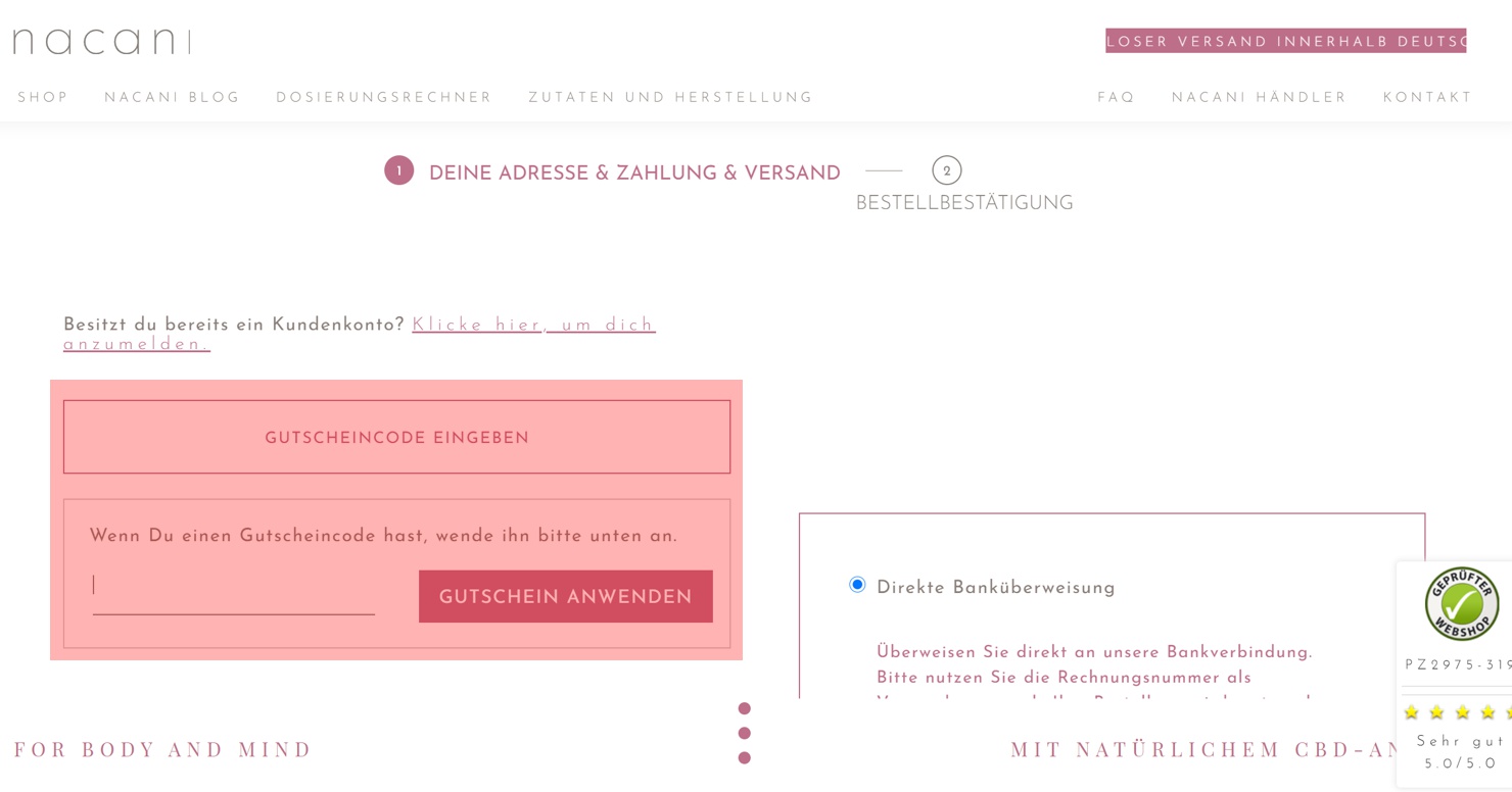 Ein Gutscheincode wird im 1. Bestellschritt "DEINE ADRESSE & ZAHLUNG & VERSAND" nach Klick auf "GUTSCHEINCODE EINGEBEN" in das erscheinende Feld 'Gutscheincode' eingegeben und durch klick auf "GUTSCHEIN ANWENDEN" angerechnet. Der Rabatt wird nur gewährt, wenn der Gutscheincode gültig ist und entsprechende Einlösebedingungen zutreffen.